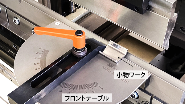 斜辺曲げ加工の際はフロントテーブルの鋭角側にワークを置いて加工してください。