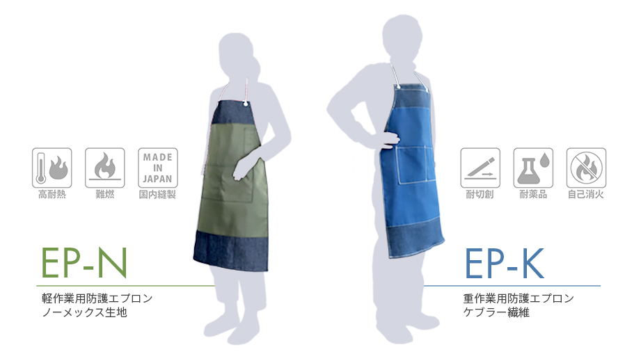 航空服やレーシングスーツにも使われる米デュポン社製「ノーメックス」生地を使用した軽量防護エプロン。難燃性、耐薬品性、電気絶縁性に優れ、 着火しても燃え広がらず摩耗にも強い素材です。一般作業や物流・倉庫管理、溶接の焼け取り、電解研磨業務など、さまざまな現場の危険から身を守ります。