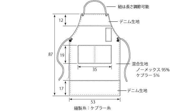 | 素材 | デニム生地(綿)、ノーメックス95%+ケブラー5% |