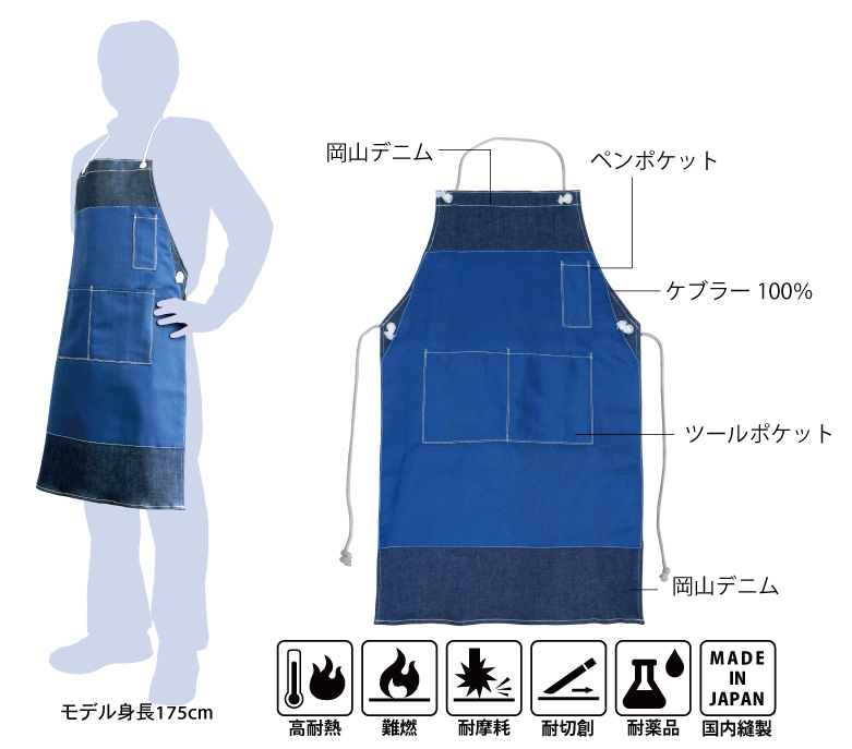 宇宙服や防弾ベストにも使用される米デュポン社製「ケブラー」生地を採用した、難燃性、耐薬品性、耐熱に優れた軽量防護エプロン。 熱に溶けず、着火しても燃え続けない素材で、溶接や高温物との接触事故から身を守ります。さらに切創にも強く、鉄板のバリが引っかかっても切れません。洗濯後も生地の防護特性が持続し、長期間使用可能です。