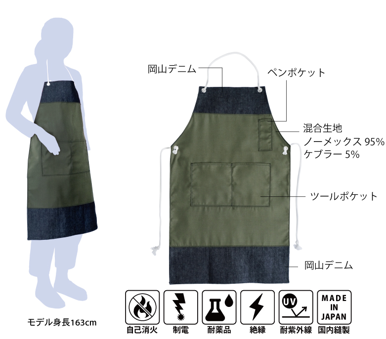 使いやすいカラー染めの防護繊維とシンプルなデニム生地を組み合わせ、今までにないおしゃれでタフな防護エプロンに仕上げました。日常のさまざまなシーンに馴染みます。