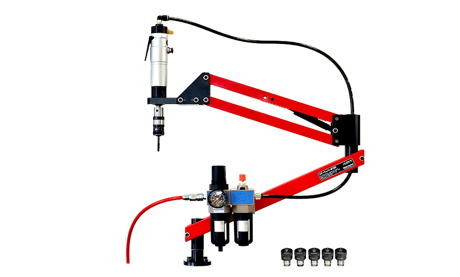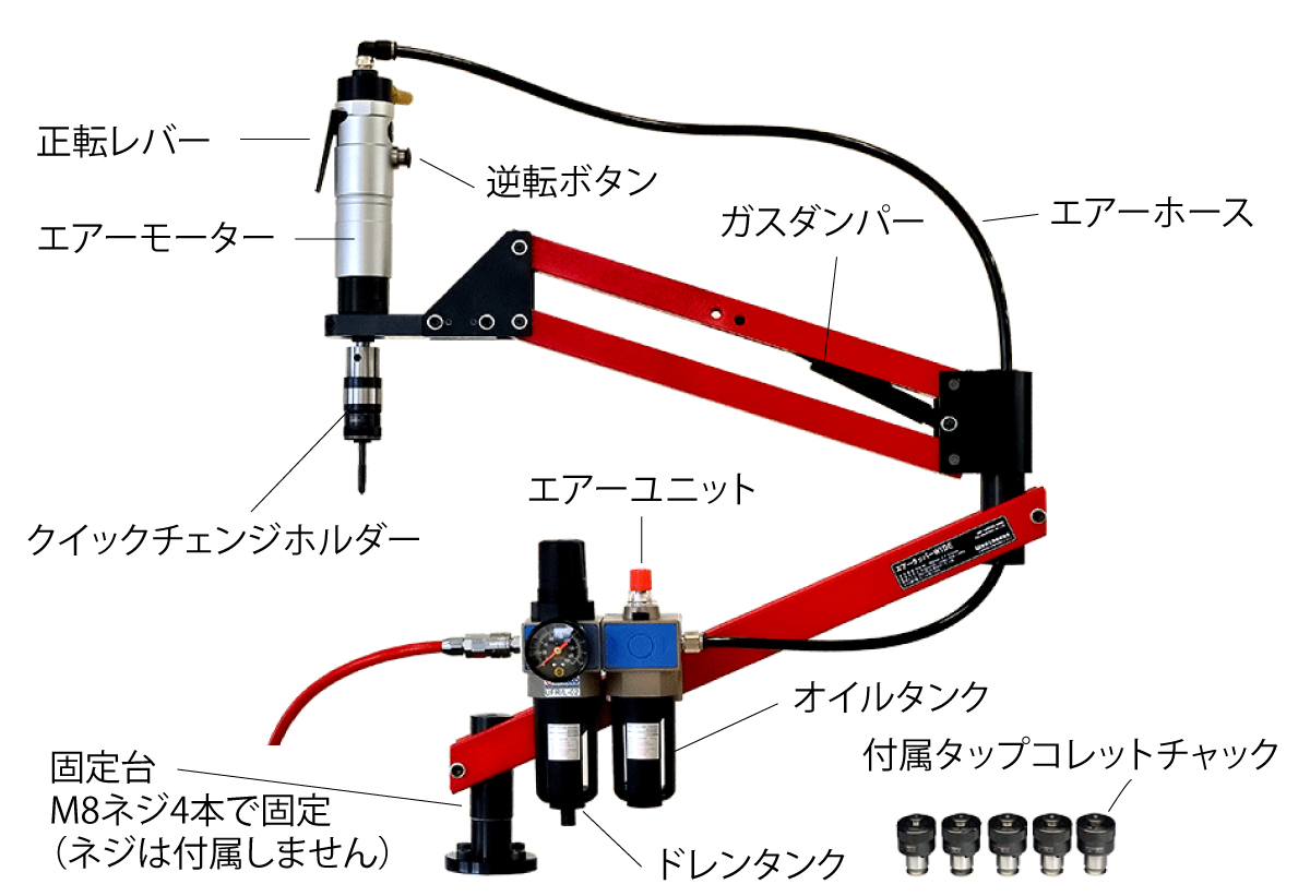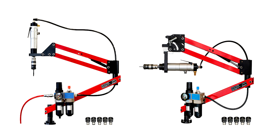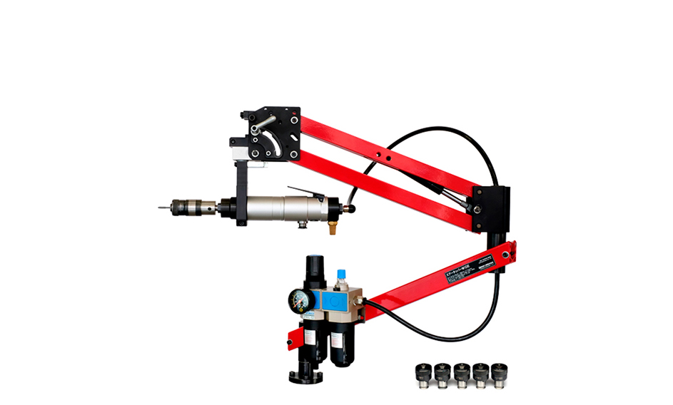 最も重要なタップ垂直精度は±1°にボルトで固定後、さらにノックピンを打ち込んで垂直精度を完全保持しています。 360°回転のフリーアーム操作でもタップが斜めにならないため加工不良が出ず、経験の少ない作業者でも正確で安定した加工が簡単に行えます。