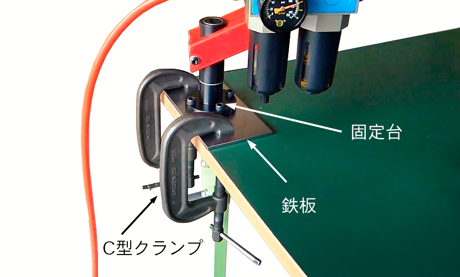 固定台に大きめの鉄板を取り付け、C型クランプ(シャコ万力)でしっかり作業台に固定する方法で、現場のどこへでも移動させられます。