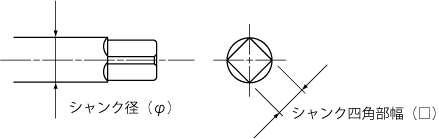 | タップサイズ | シャンク径(φ) | シャンク四角部幅(□) | タップ下穴目安径(mm) |