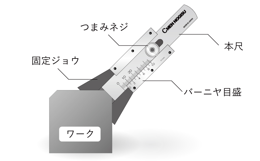 - 従来のC面ゲージは隙間を見ながら判断する曖昧な目測ですが、C面ノギスはバーニヤ目盛で読み取るため、より正確な測定ができます。
