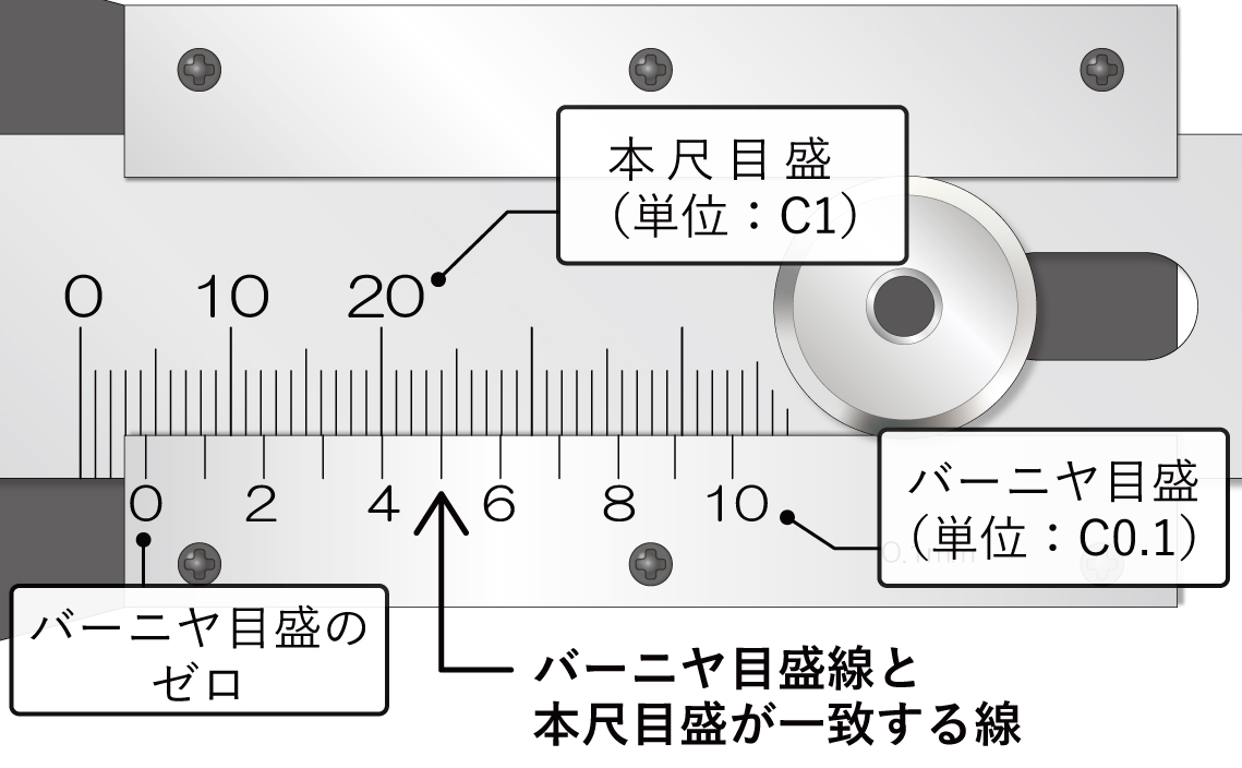 本尺はつまみネジを締めて固定することができます。バーニヤ目盛を読みながら本尺を取りたいC面寸法に合わせてください。