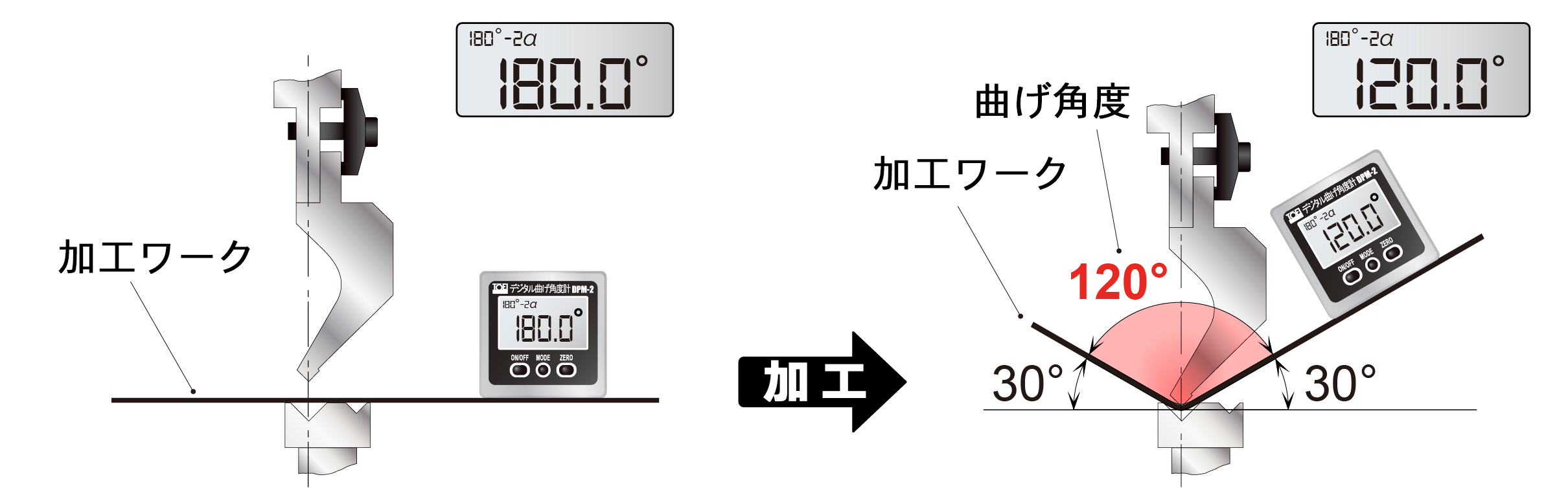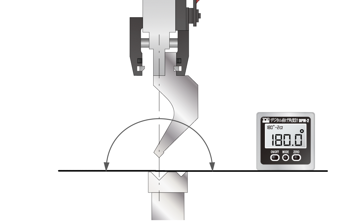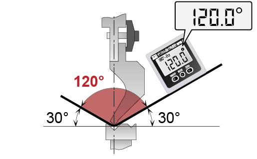 180°-2αの曲げ角度モードで、曲げ加工中の板の角度がそのまま表示されます。 表示角度はリアルタイムで計測されるので、加工作業をしながら曲げ角度の確認ができます。