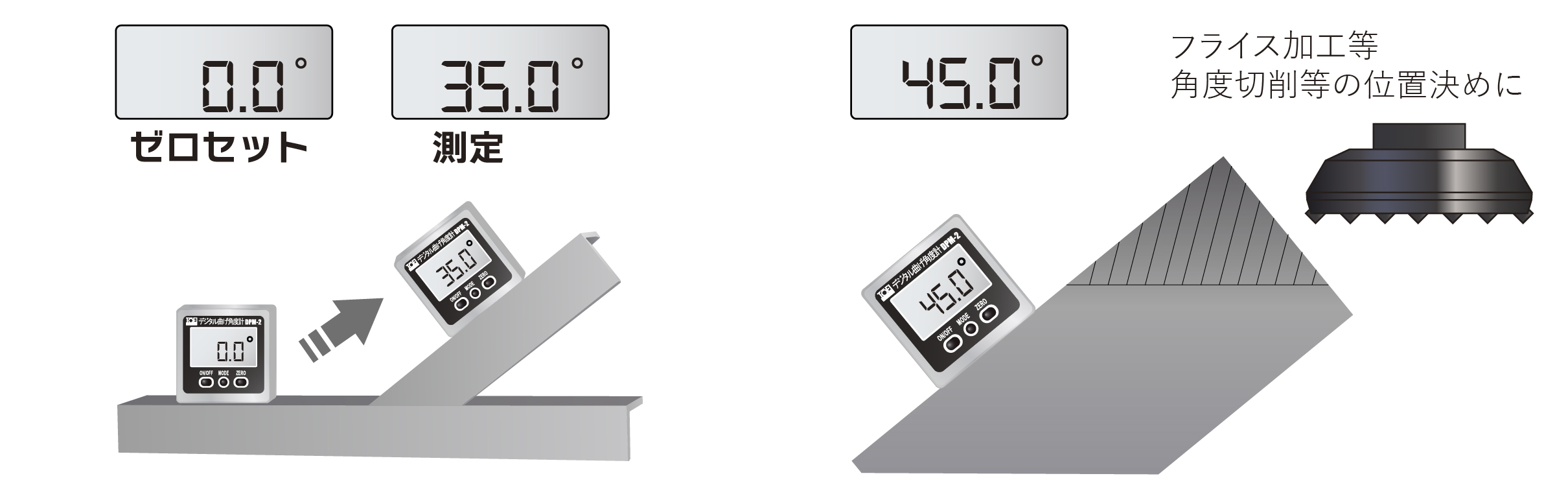 一般角度モードで通常の角度計として使用できます。 任意の角度を0°にセットし、その位置からの測定ができます。加工材を曲げた後の検査、鉄骨加工、機械加工用に便利です。