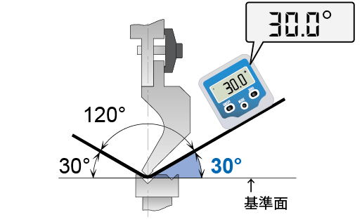 一般的な角度計で板金の曲げ角度を測る場合、基準となる0度からの傾き角度が表示されます。そのため、曲げ角度は計算して求める必要があります。