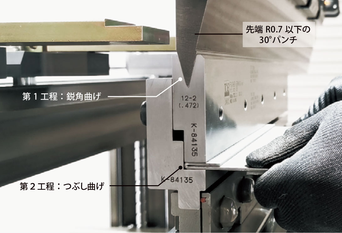 ダブルデッキ構造ならではの鋭角曲げとつぶし曲げの連続加工が、金型交換なしで行えます。